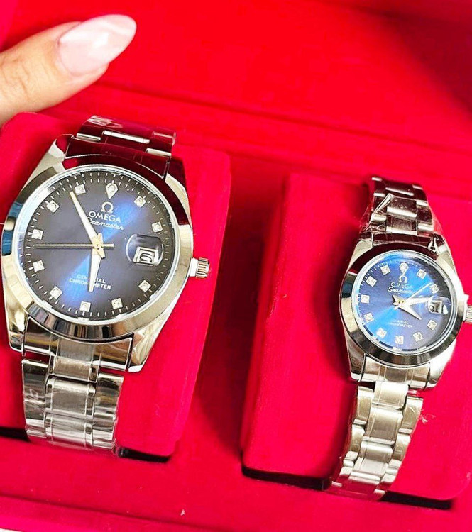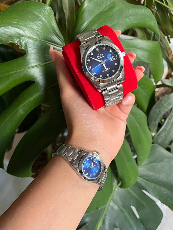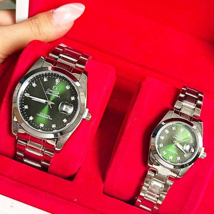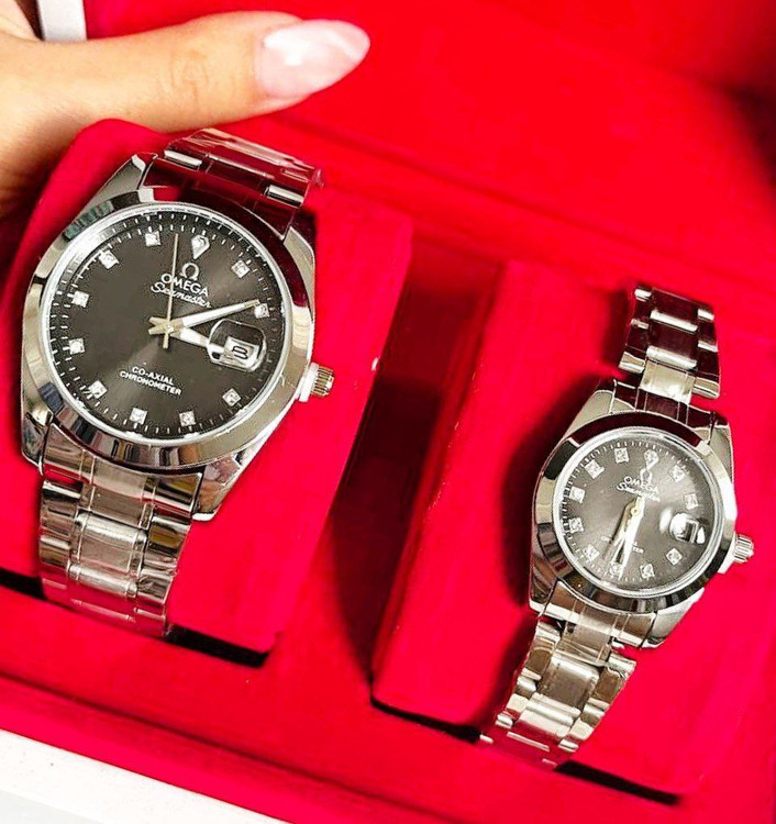 ساعت ست زنانه مردانه برند امگا OMEGA بند استیل با کیفیت موتور تایوان،قفل پروانه ای دارای تقویم روز شمار رنگ ثابت ،ضدآب دارای یک سال گارانتی موتور 1100تومان