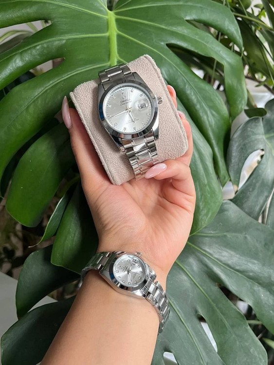 ساعت ست زنانه مردانه برند امگا OMEGA بند استیل با کیفیت موتور تایوان،قفل پروانه ای دارای تقویم روز شمار رنگ ثابت ،ضدآب دارای یک سال گارانتی