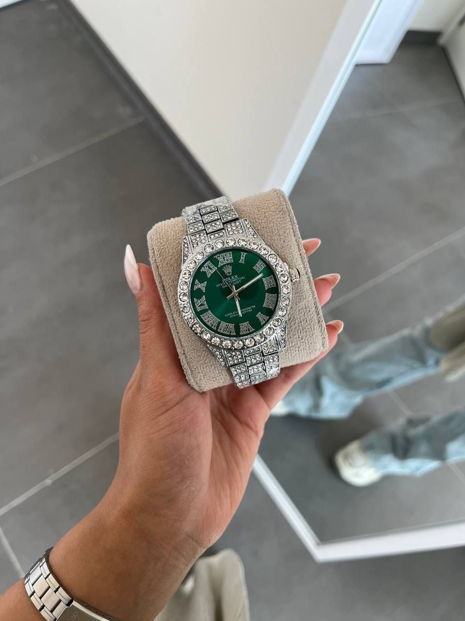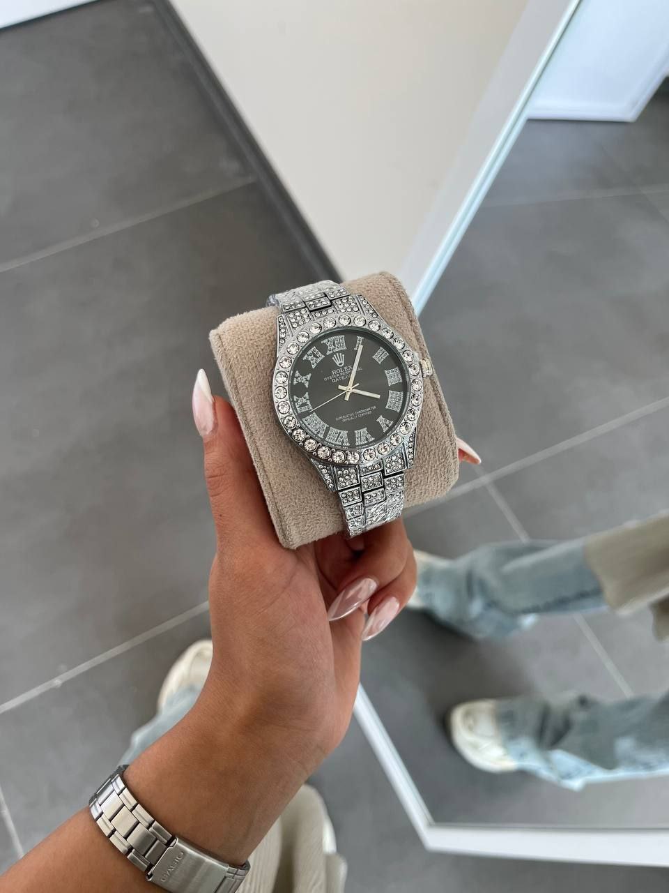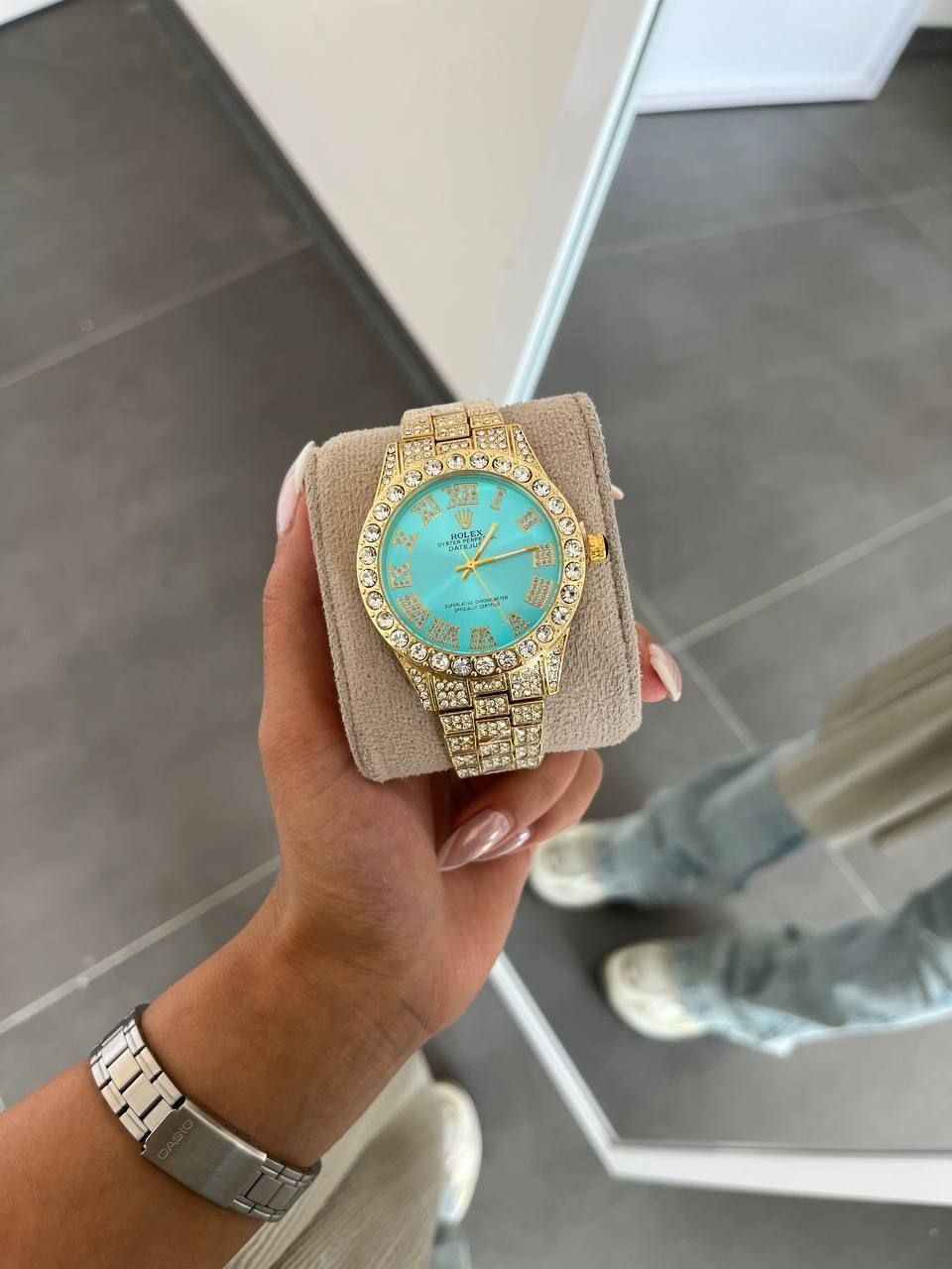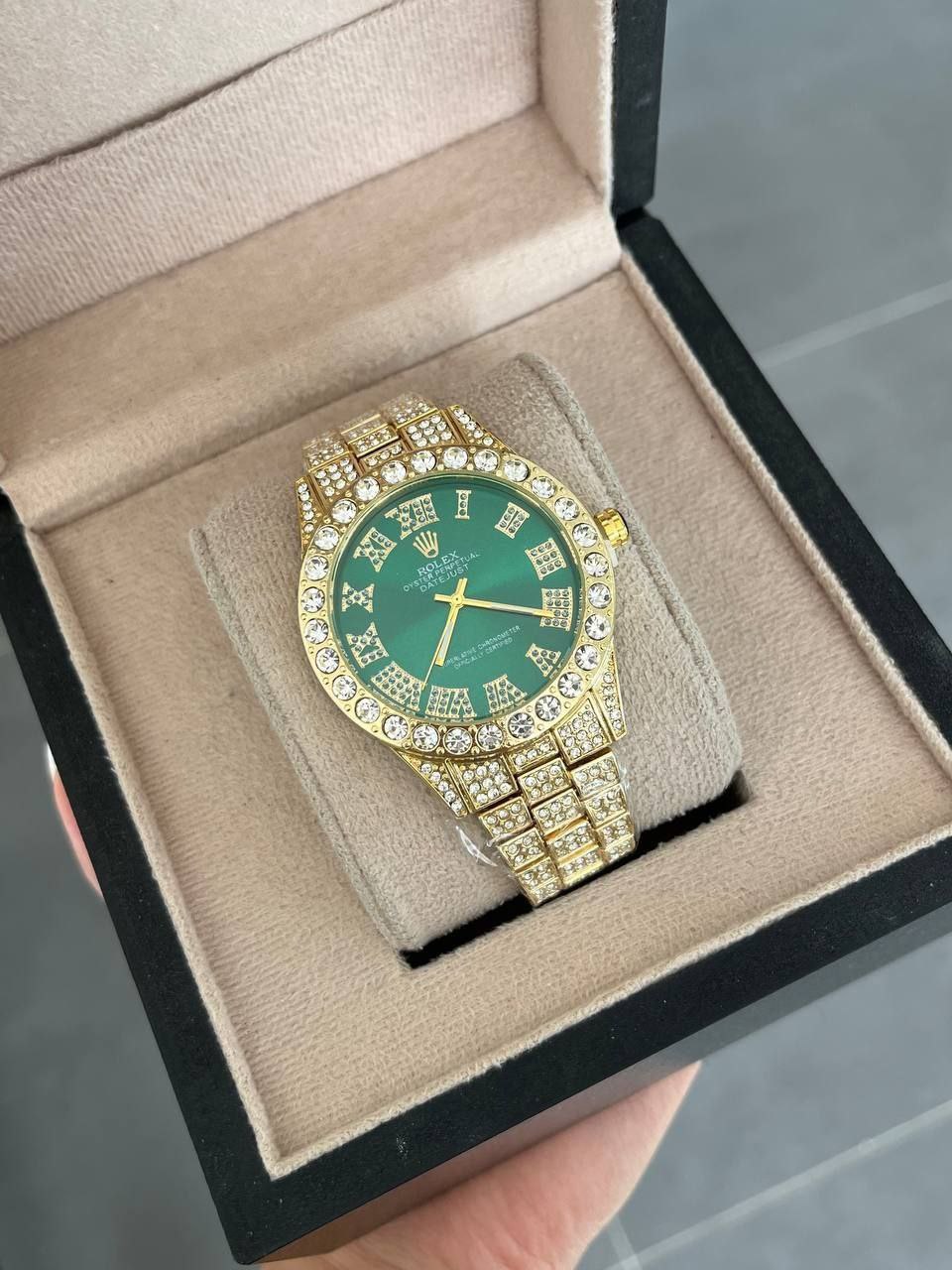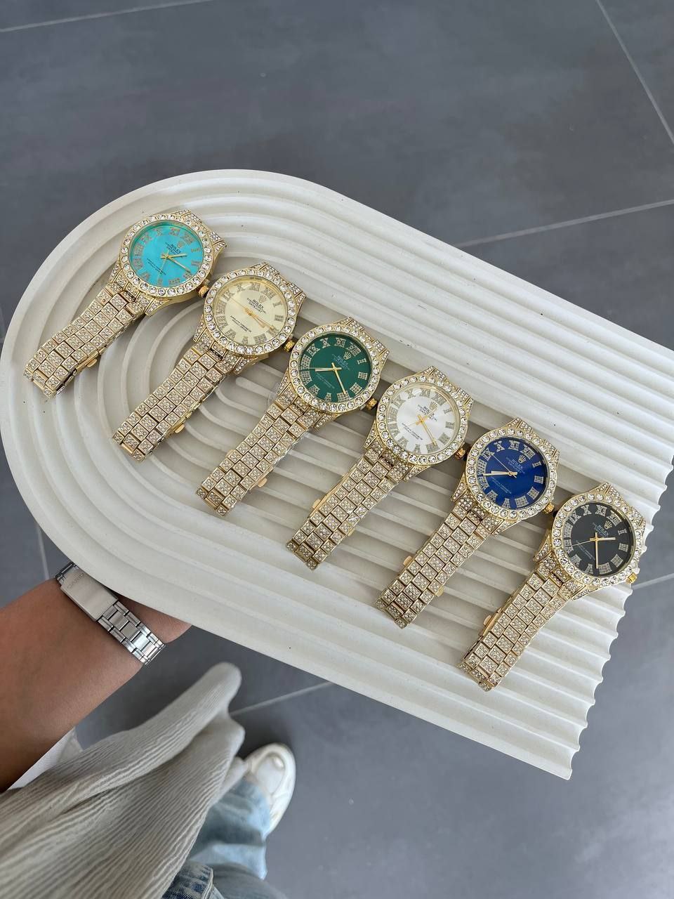 ساعت رولکس گرد فول نگین صفحه یونانی ,طرح مجلسی قاب نگین دار,موتور کوارتز قفل دستبندی ,ضدآب رنگ ثابت